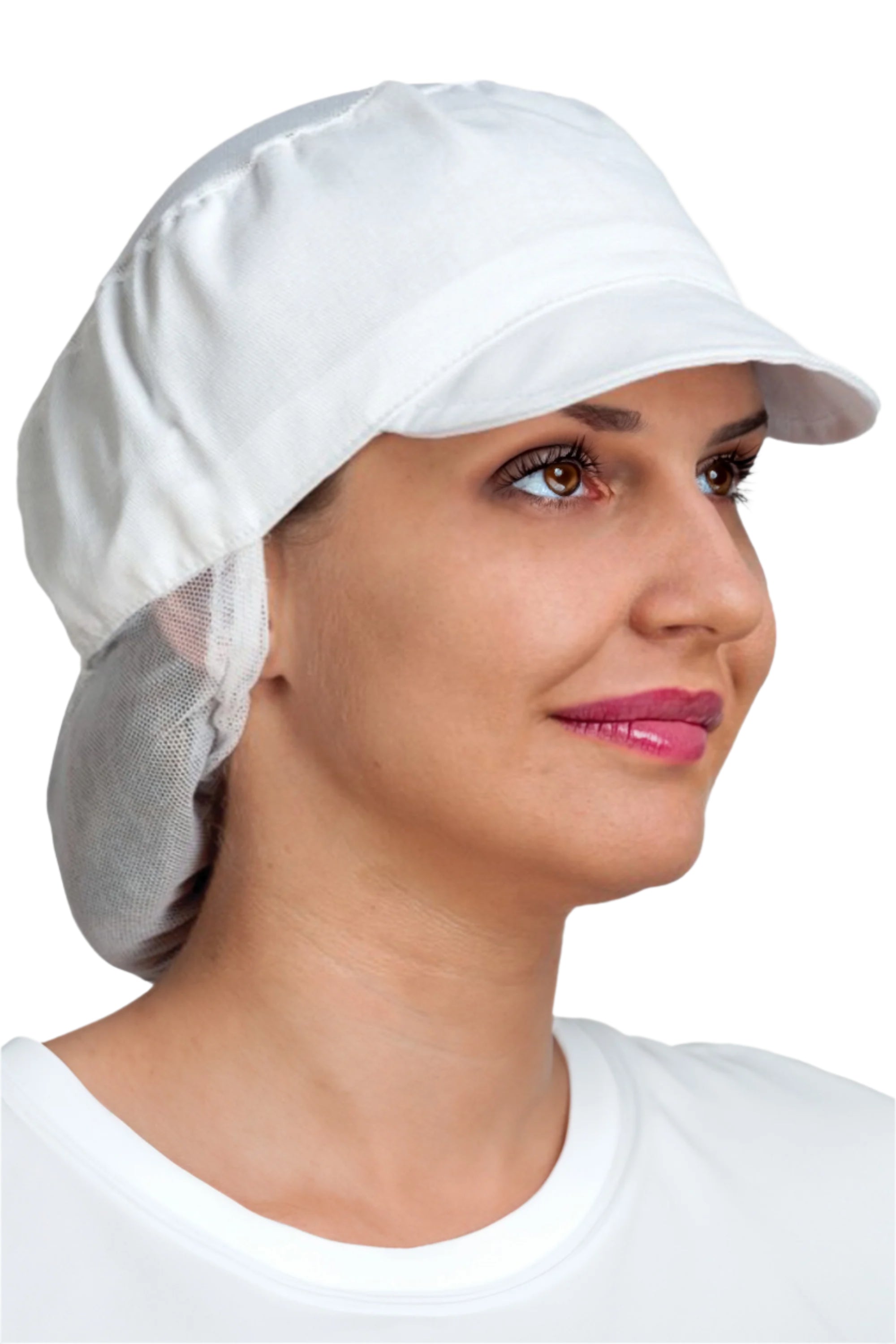 Boneta Theia tercot 200 g, cu cozoroc și plasă ventilată. Ideală pentru bucătari și industria alimentară.
