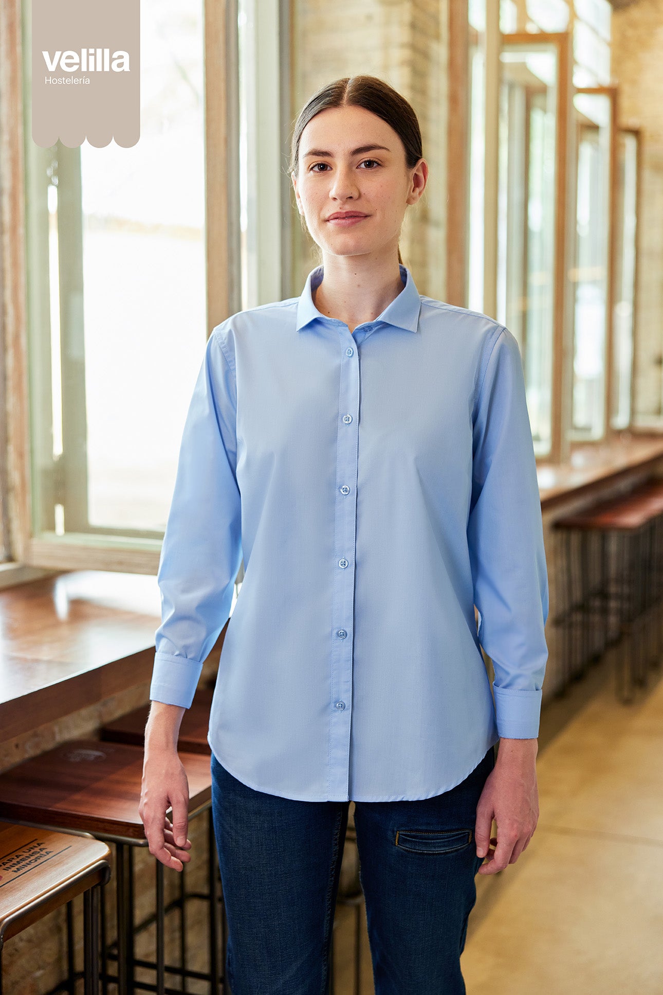 Modelul 405011 este o cămașă damă cu mânecă lungă, din poplin 115g, cu guler italian, clapetă frontală dublă, platcă pe spate și barete elegante pe piept și spate. Ideală pentru ținute de lucru sau uniforme elegante.Caracteristicile principale ale produsului: