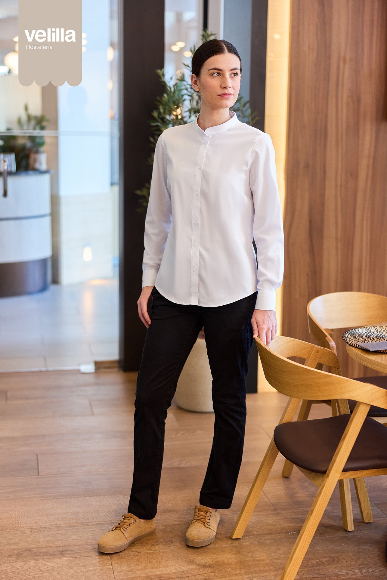 Cămașă stretch cu mânecă lungă pentru damă, croială semi-fitted și material respirabil – ideală pentru birou sau uniformă.
