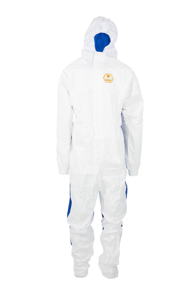 CONSTRUCTIE: combinezon cu gluga, deschidere în fata cu fermoar, acoperit cu fenta, fixata cu banda adeziva, elastic la spate, in talie, mansete, glezne şi gluga. Partea din fata (culoarea alba) material MPF si partea din spate (culoare albastra) material SMS pentru confort.