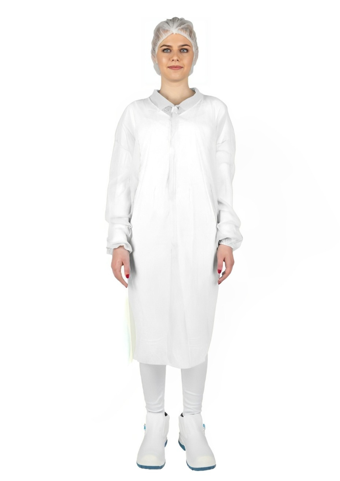 Halatul de laborator este confecționat din vâscoză de polipropilenă netesută (nonwoven PP), oferind protecție de bază în medii igienico-sanitare, alimentare sau industriale. Este prevăzut cu 4 benzi velcro cusute, ceea ce asigură o închidere rapidă și sigură, fără nasturi sau capse.
