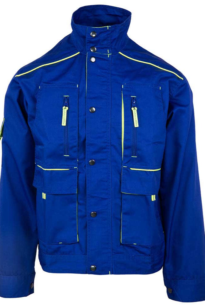 CONSTRUCTIE: jacheta de lucru, inchisa frontal cu fermoar, acoperit cu fenta inchisa cu capse, 4 buzunare frontale (2 la piept inchise cu fermoar si 2 laterale inchise cu clapeta si velcro), maneci drepte terminate cu manseta.