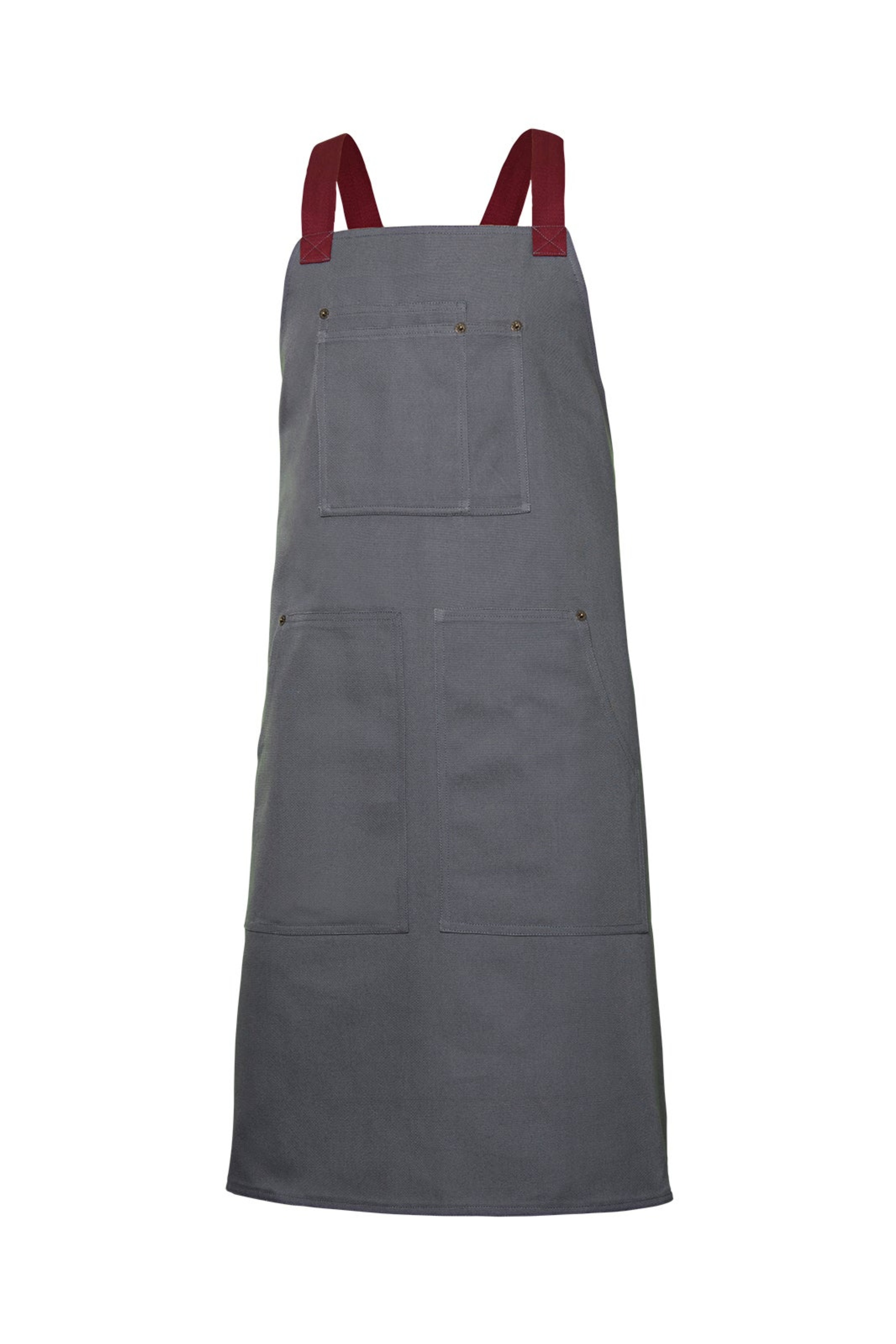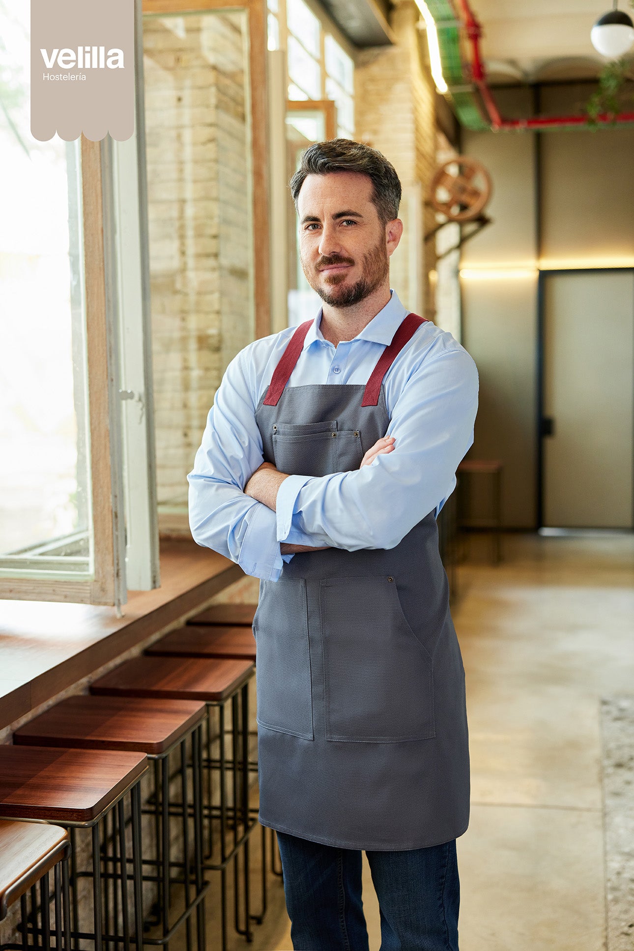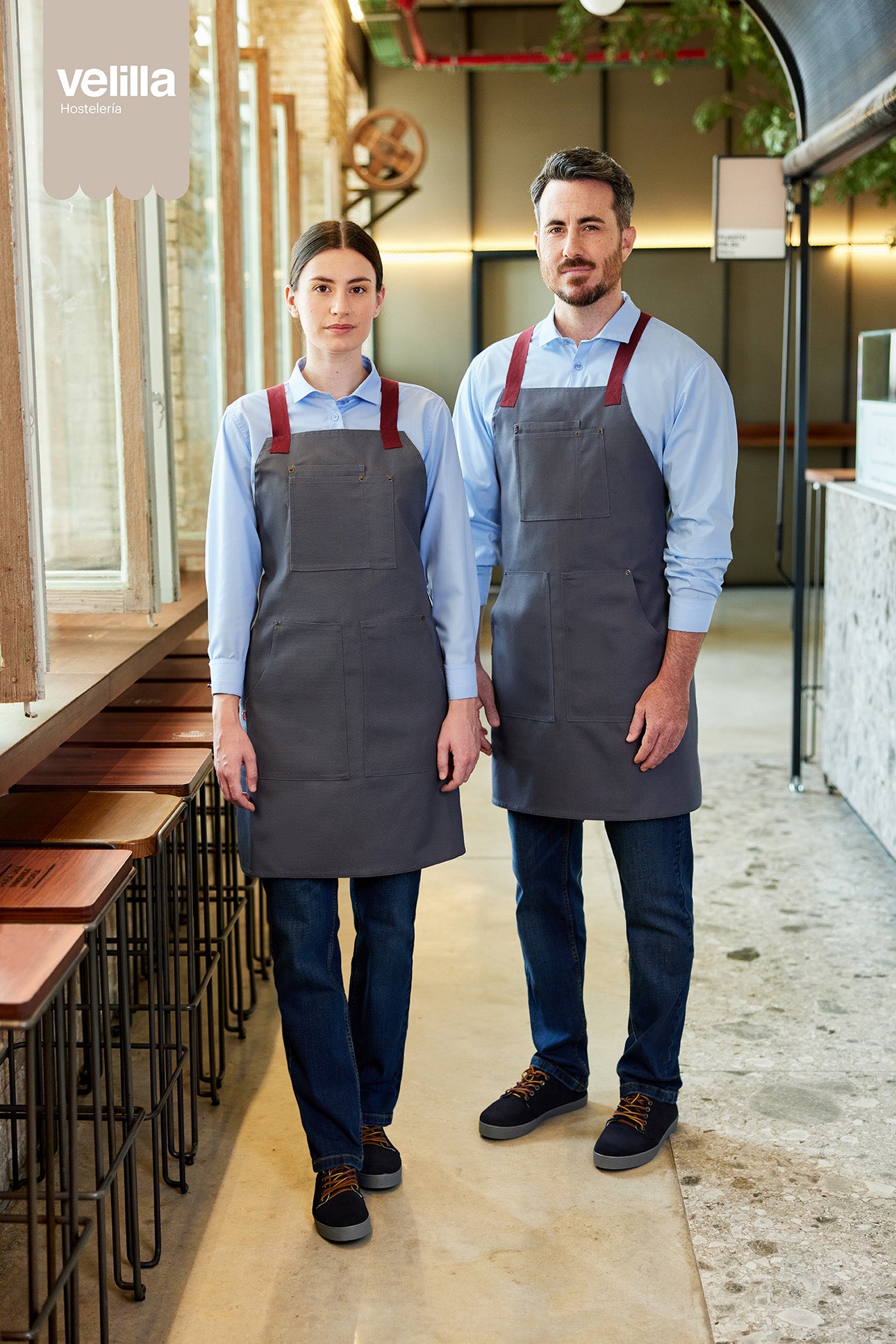 Conceput din canvas gros de 300g, acest șorț cu pieptar oferă un look robust și profesional. Detalii denim precum niturile și spatele încrucișat, împreună cu curele contrastante din bumbac, îl fac potrivit pentru medii de lucru solicitante. Include 4 buzunare: un buzunar dublu pe piept cu spațiu pentru stilou și două buzunare laterale. Material: 65% poliester + 35% bumbac.Caracteristicile principale ale produsului: