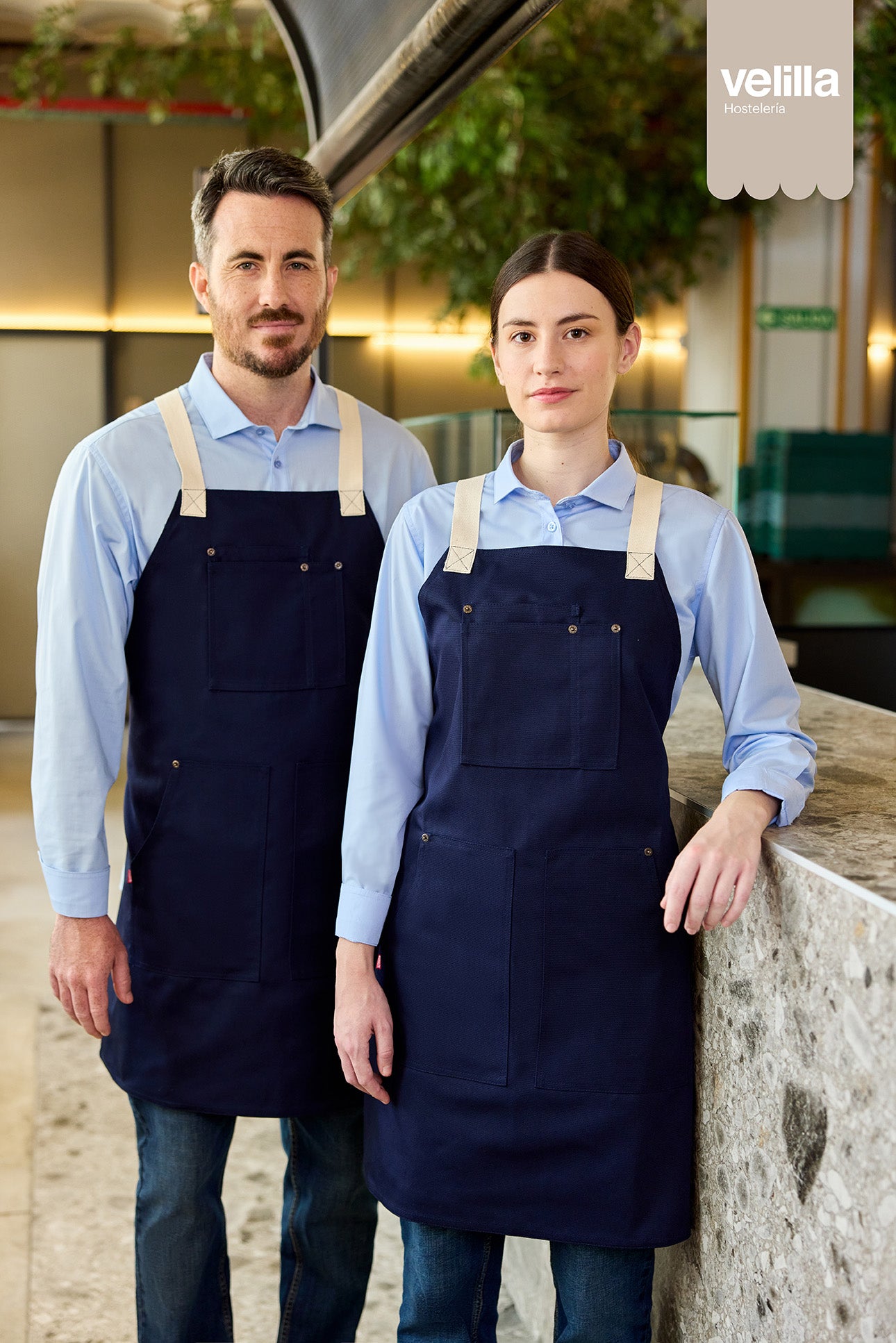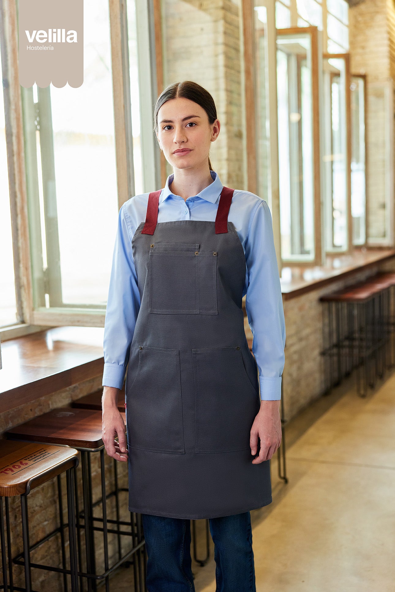 Șorț durabil cu design stil denim, 4 buzunare și spate încrucișat. Ideal pentru bucătari sau barmani.