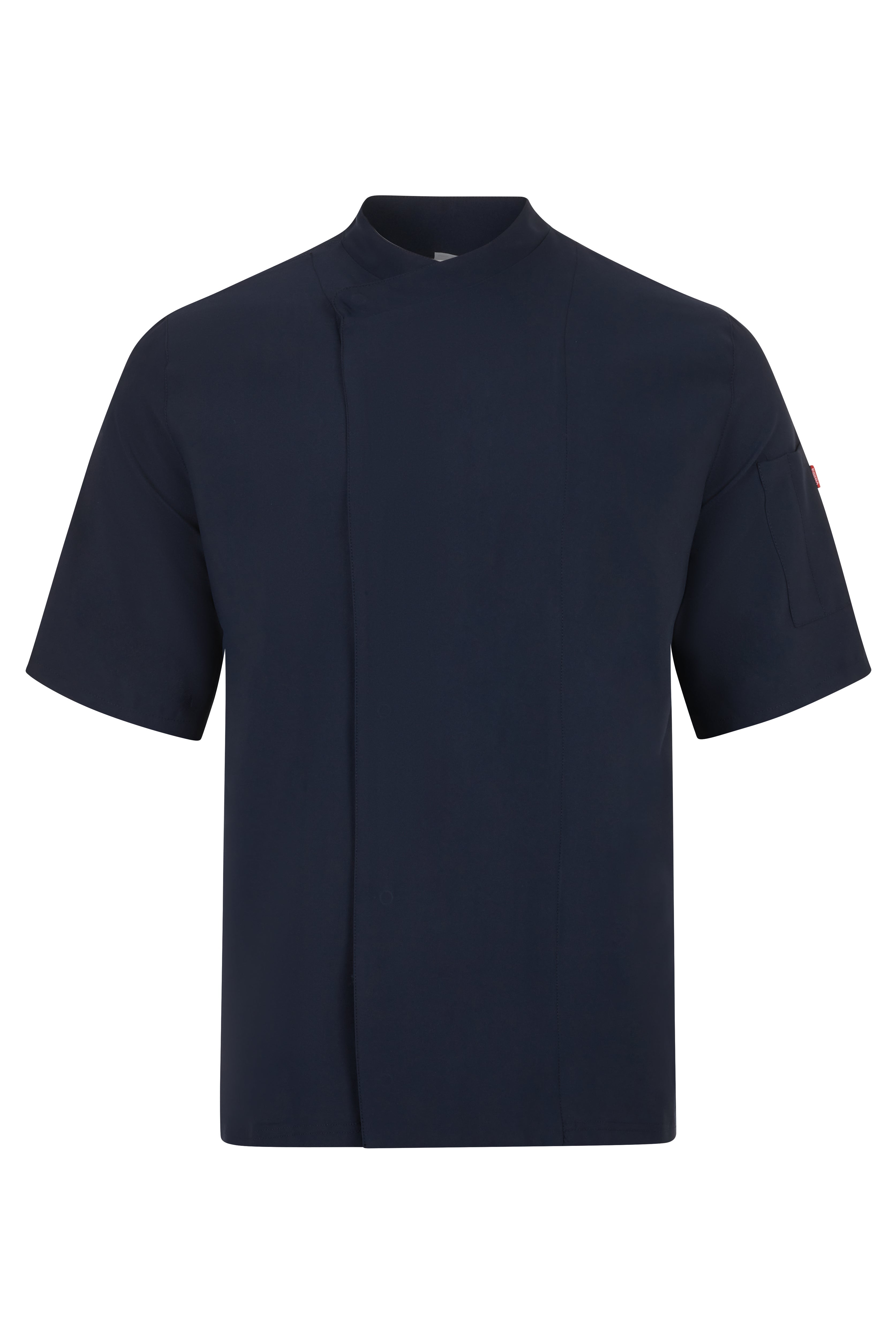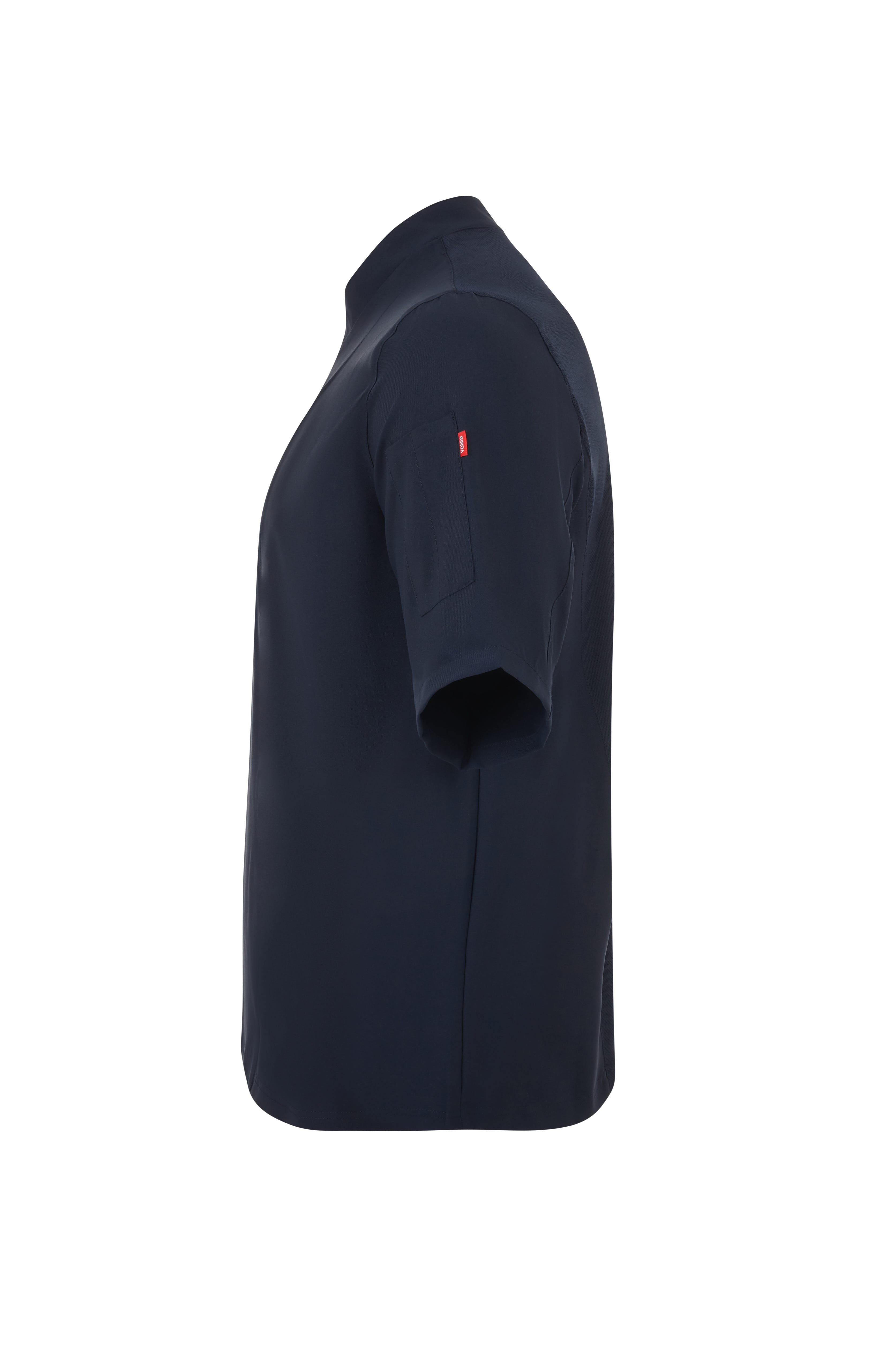 Tunică asimetrică cu capse, guler cu bandă și spate Coolmax – igienă și confort în bucătărie.