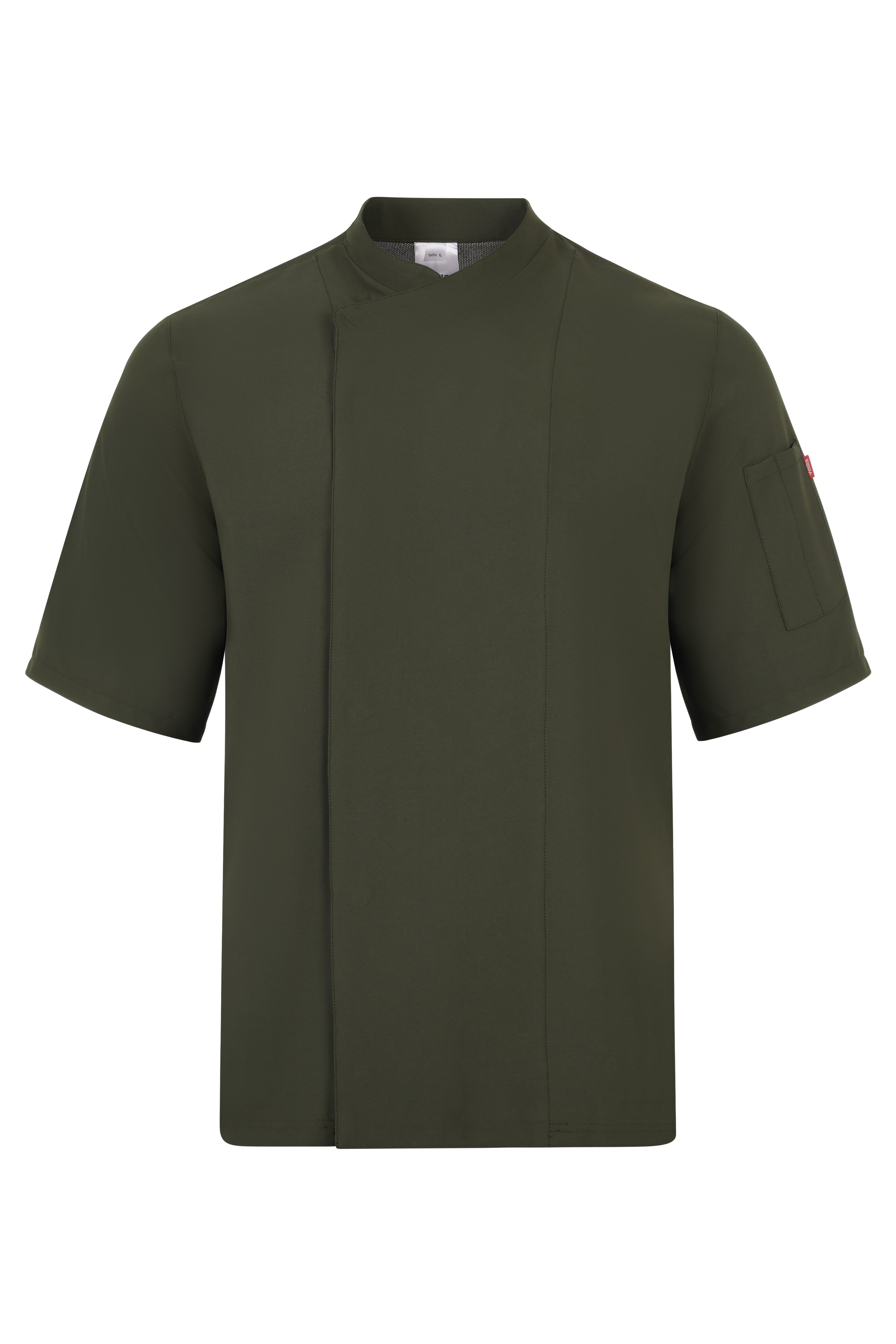 Tunică asimetrică cu capse, guler cu bandă și spate Coolmax – igienă și confort în bucătărie.