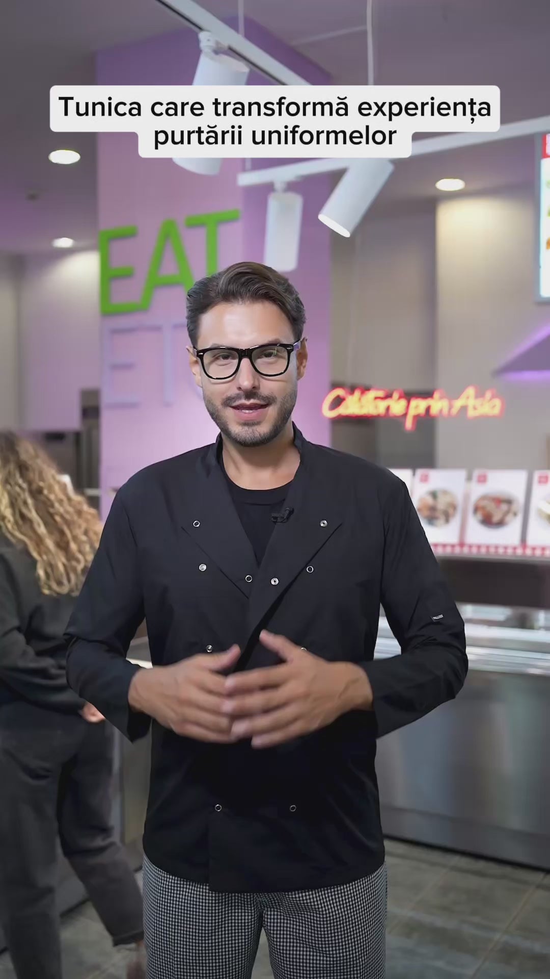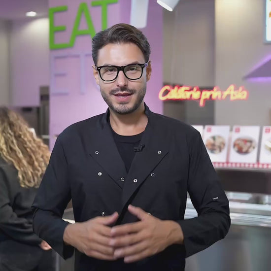 Tunica de bucatar neagra, confecționată din 65% poliester si 35% bumbac. Tesatura extrem de usoara si vaporoasa, care nu se sifoneaza si se potriveste perfect pe corp. Tunica de bucatar are o croiala dreapta, lejera, care permite libertate de miscare. Modelul apartine marcii PALLTEX - haine pentru restaurante si hoteluri.