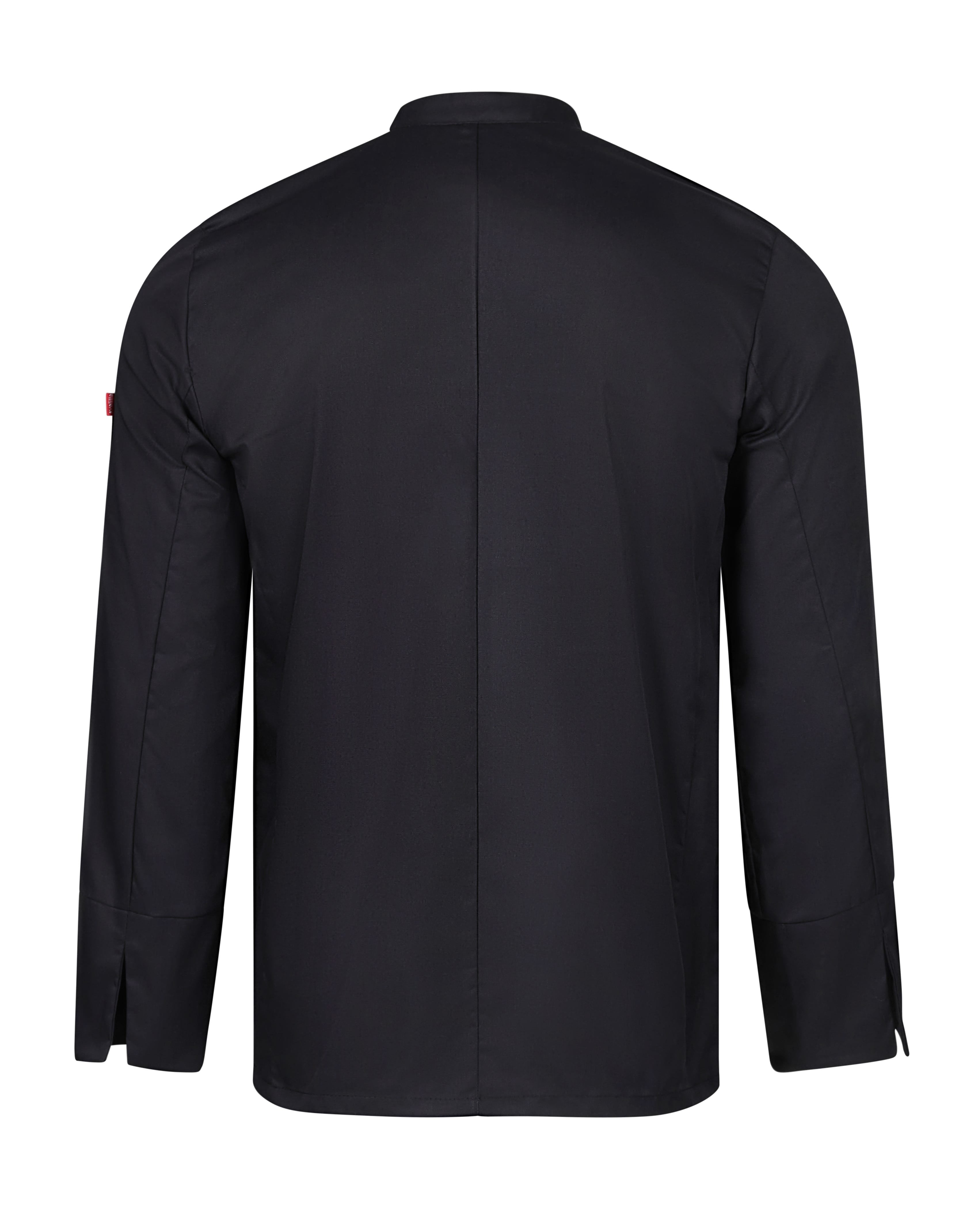 Tunică din tercot cu nasturi ascunși, guler Mao și buzunar lateral – potrivită pentru bucătari profesioniști.