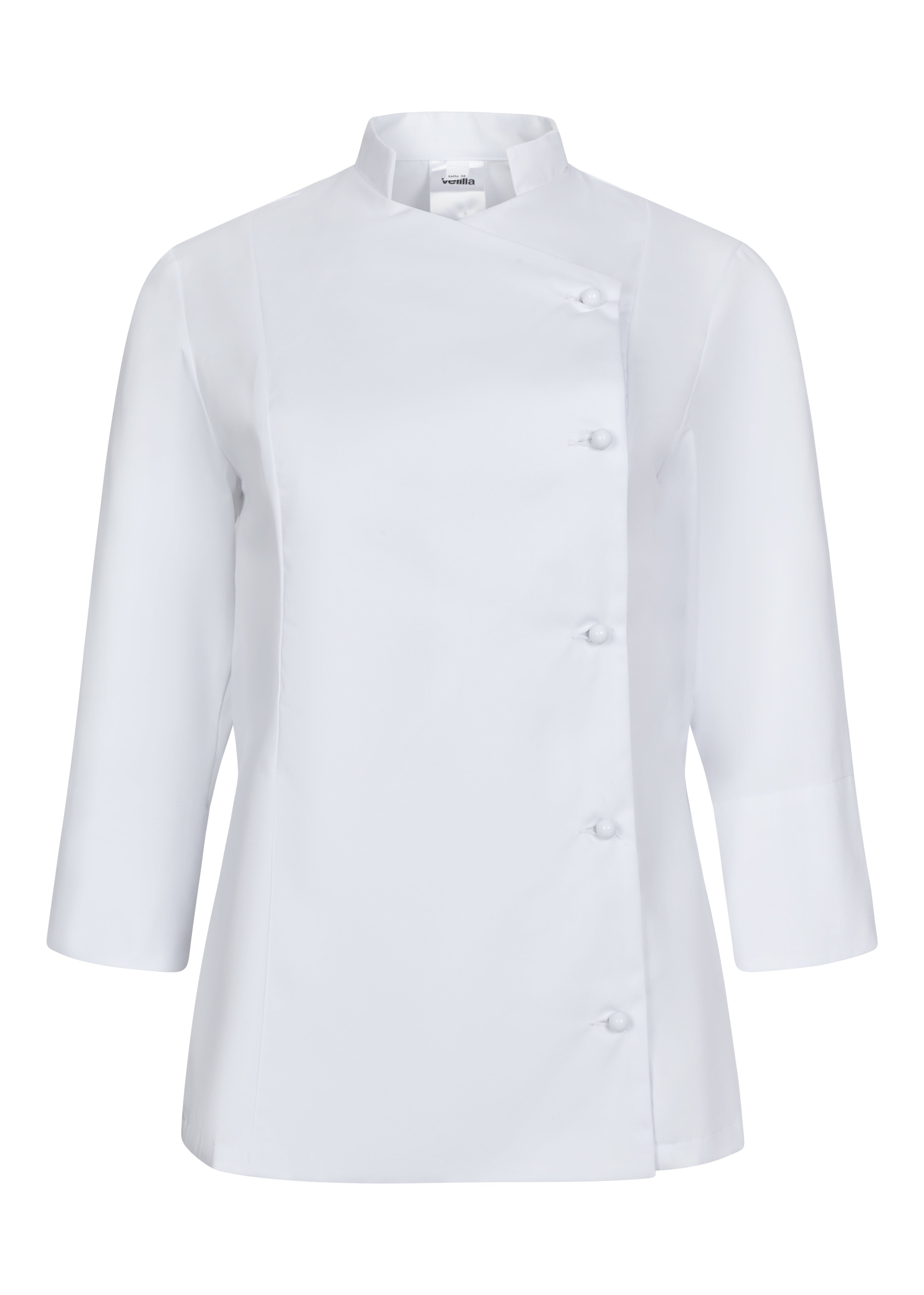 Melisa este o tunică elegantă de bucătar destinată femeilor, cu design funcțional și profesional. Realizată din tercot de 200 g/m², compus din 65% poliester și 35% bumbac, oferă durabilitate și respirabilitate. Dispune de închidere frontală asimetrică cu nasturi, mâneci croite fără cusături laterale și un design ce permite mișcări lejere în timpul lucrului. Perfectă pentru medii profesionale din industria alimentară.Caracteristicile principale ale produsului: